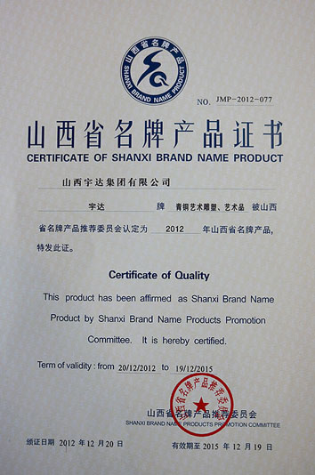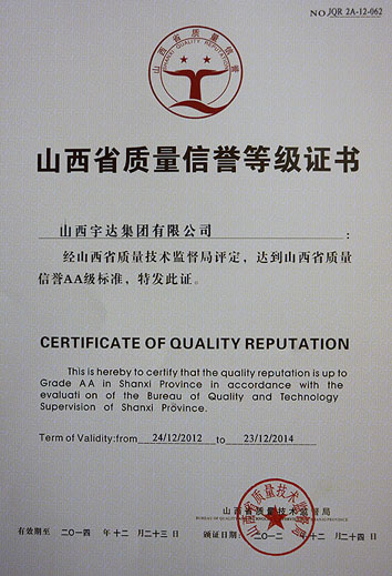 宇達榮獲"山西省名牌產品"稱號及"山西省質量信譽AA級"榮譽