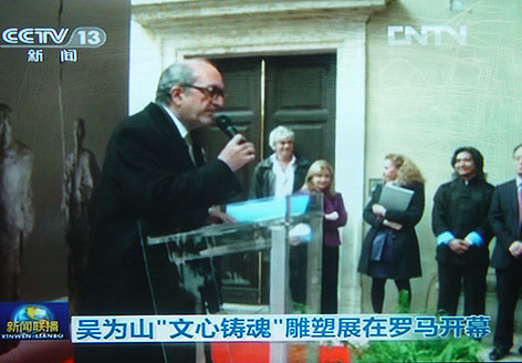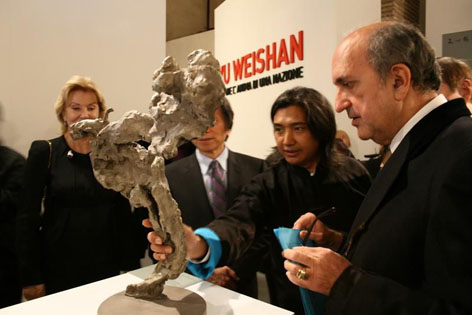 參觀結束前,賈慶林主席久久地緊握吳為山的手說:"你作為人民政協委員,作為藝術家,為祖國贏得榮譽,為政協爭光,你在聯合國總部舉的展覽,很好的宣傳了中國文化。又在文藝復興的圣地意大利舉辦展覽。意大利是具有悠久藝術傳統的國家,你的作品受到了國際社會的高度評價,應感謝你!""文心鑄魂-吳為山雕塑藝術國際巡展,意大利羅馬威尼斯宮展"由中國和意大利兩國文部及中國駐意大利大使館主辦。是中國藝術家個展首次進入具有五百多年歷史的藝術圣殿,展覽以對話的文化理念展開了與文化巨匠,現實生活,民族同胞的對話。雕塑藝術以寫實,寫意相融匯的手法,富于歷史性,現實性!藝術性和思想性。正如十一月二十三日在展覽開幕式上意大利總統辦公廳主任迪多先生致辭中所說,中國是人類文明古國,它正在進行著意大利曾經經歷過的文藝復興。中國的文藝復興根源于儒家思想以及其它哲學和藝術傳統。吳為山的作品可以說是一連接過去現在和未來的橋梁,代表了中國現代藝術的發展,其中飽含著傳統與創新。從他的藝術可以感受到人類前進的步伐。意大利國家文物局長在致辭中說,吳先生的藝術令人震撼!完全可與意大利現代史上偉大的雕塑家曼祖,賈戈梅蒂比肩!我們看到了中國經濟發展后,藝術發展的狀況。