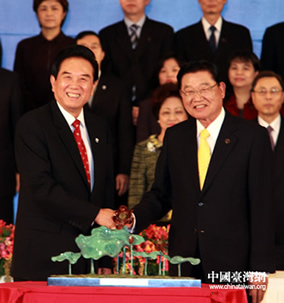 2010年12月21日下午,海協會會長陳云林與?;鶗麻L江丙坤正式簽署《海峽兩岸醫藥衛生合作協議》,雙方并在協議簽署后互贈禮品。圖為海基會致贈海協會方面的陶土作品《齊心傳唱 和諧天籟》。 兩岸兩會領導人第六次會談21日在臺北舉行,海協會會長陳云林和海基會董事長江丙坤于當天下午正式簽署《海峽兩岸醫藥衛生合作協議》。協議簽署后,雙方互贈紀念品。 ?;鶗沦浐f會方面的禮品是名為《齊心傳唱 和諧天籟》的一組陶土雕塑作品。海協會回贈海基會方面的是一尊蓮花造型雕塑《好事連連》,寄托對兩岸關系和平發展的款款美意。(特派記者 李徽) (來源:中國臺灣網) | |